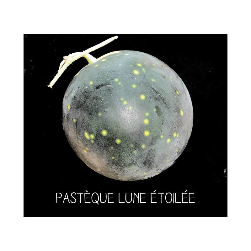 Petite pastèque à chair rouge et épiderme vert presque noir avec des taches jaunes rappelant le ciel et la nuit. Fruit sphérique. Plante productive et rustique, coureuse.