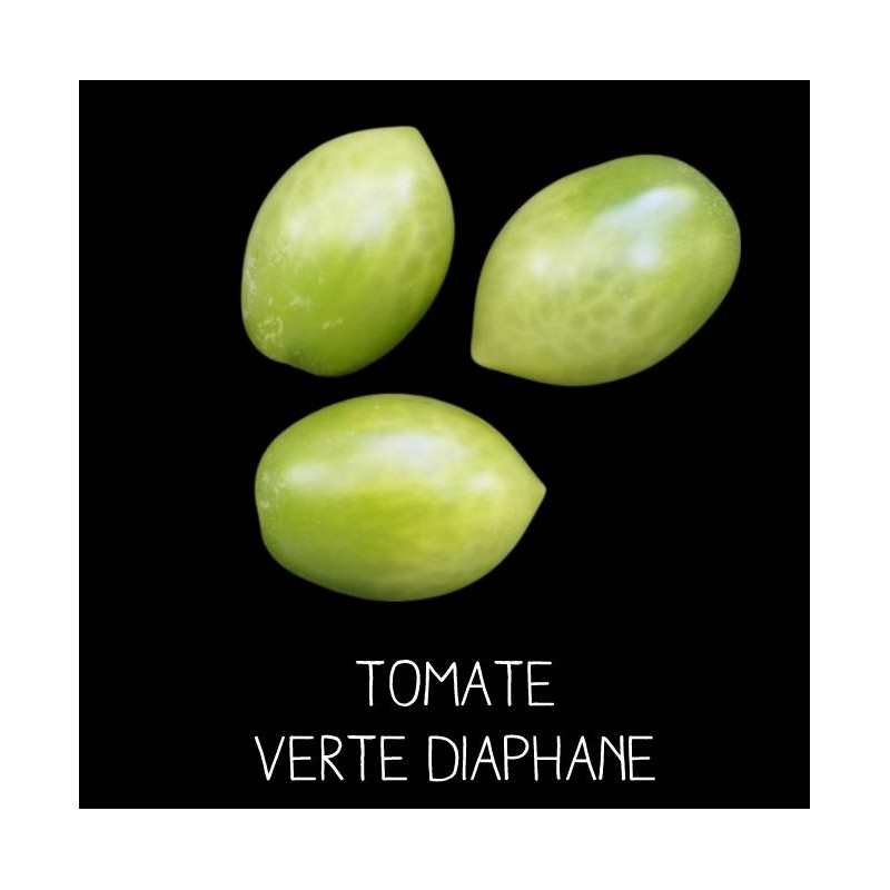 Une tomate de création récente qui ressemble à une prune ovale avec mucron (petite pointe au bout du fruit). Sa couleur verte translucide laisse apparaitre les "veines" du fruit. Son goût est très sucré, comme la tomate raisin vert, on ne taille pas.